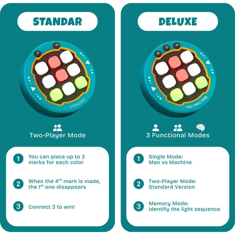 Pick the TicTacGame that suits you best. Both versions bring the classic game to life with LED lights and sound effects — it’s just a matter of how you want to play